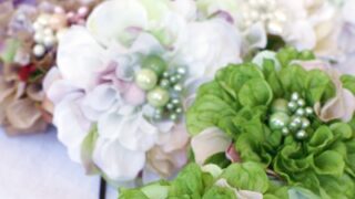 レッスン作品。まるで結婚式のゲストテーブル♪グリーンの組み合わせで夏の涼しいブーケが完成しました♪本日、芍薬満開^^